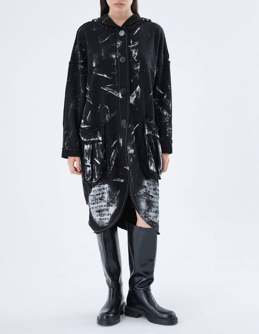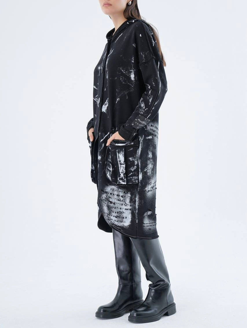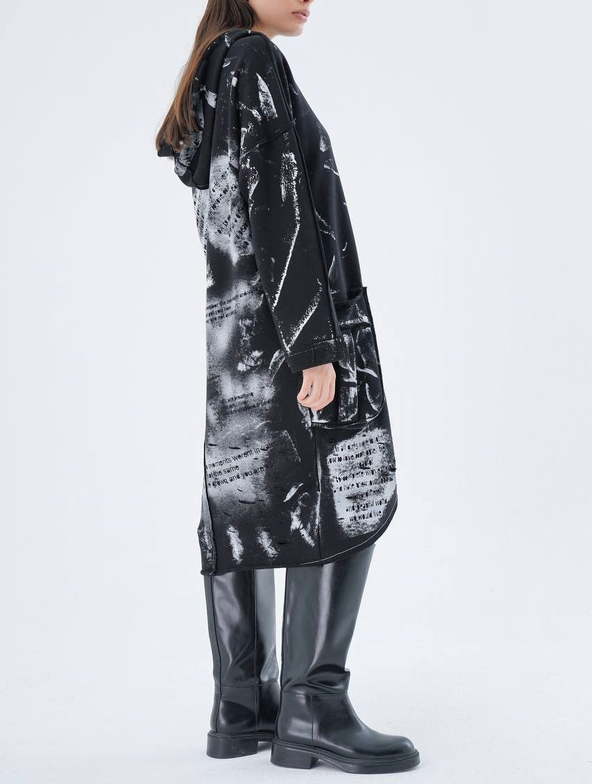 Our Foxy Cardigan in black features white sketching design all over, relaxed fit, hooded and snap buttons closure. Purchase a size up for an extra oversized look or purchase a size down for a tighter and more fitted appearance.